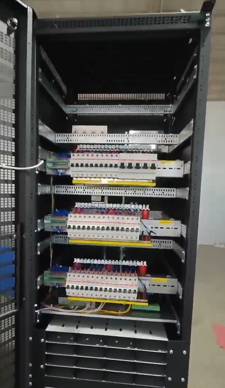 ตู้พลังงานนี้ ขนาด H2000W600D650mm มีประตูหน้าและห้อง IP20 ป้องกันสิ่งแข็งมากกว่า 12mm เพื่อปกป้องส่วนประกอบภายในรองรับการเข้า 208Vac (3L+N+PE) 3 ขั้นตอน 2 ทาง, พร้อมกับ 2 เครื่องตัดไฟฟ้าหลัก ABB C200/3P MCCB และ 2 เครื่องตัดไฟฟ้า SPD ABB TYPE 2 เพื่อเพิ่มความปลอดภัยทางไฟฟ้ารวม 32 Flatpack2 48/3000HE หน่วยสําหรับการออกกําลังแรงสูงที่มั่นคงอุปกรณ์พร้อมกับตัวควบคุม Smartpack2 เครื่องรับอากาศของแบตเตอรี่ขนาด 10 เมตร และ LVBD รับประกันความมั่นคงของระบบแผนไฟฟ้า 3 ดีซี มี ABB MCB: แผนที่ 1 (1020A/1P, 540A/1P); แผนที่ 2 (540A/1P, 1063A/1P); แผนที่ 3 (1080A, 5125A) ปรับตัวได้อย่างยืดหยุ่นกับภาระต่าง ๆ